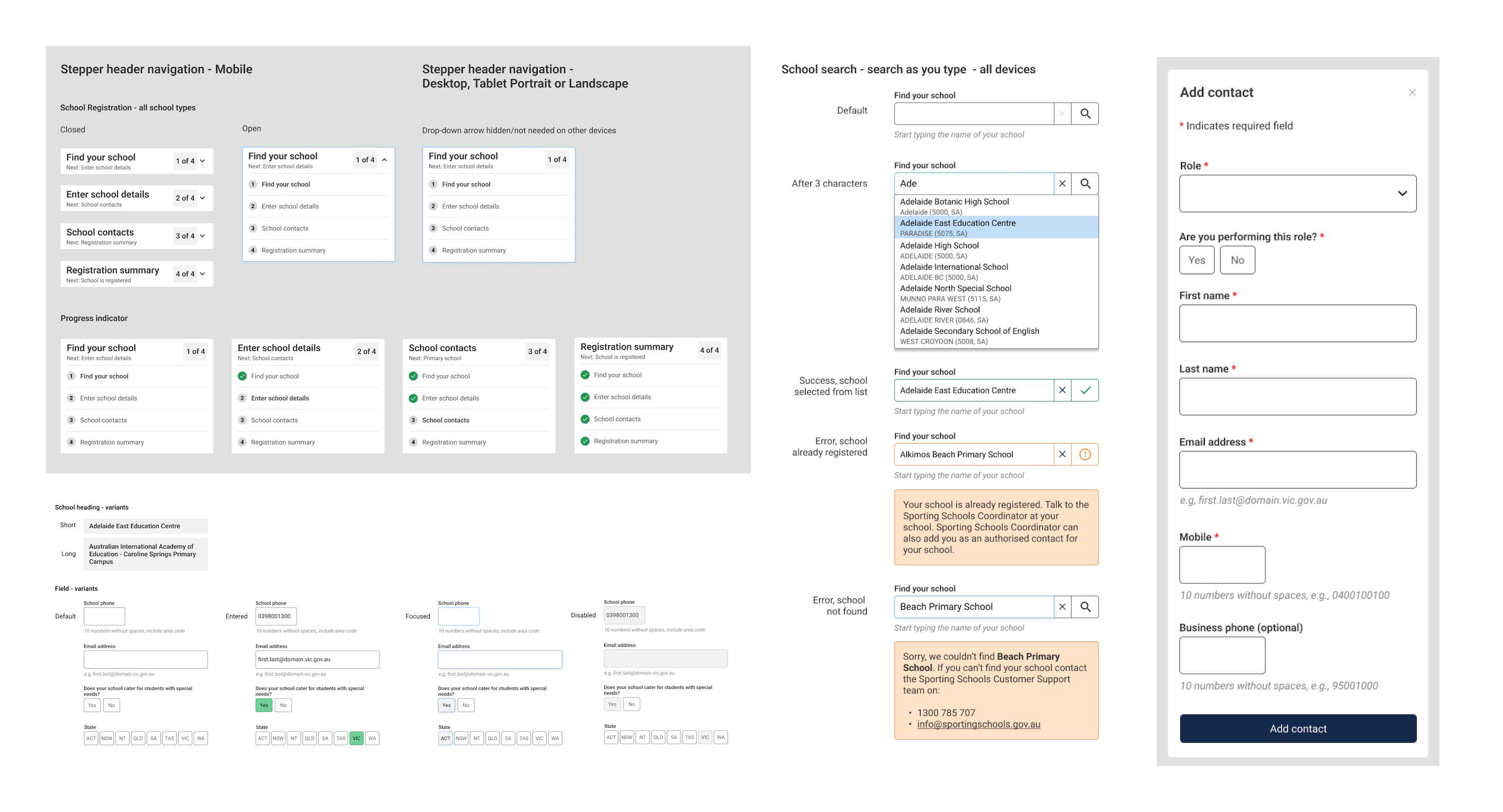 Following an iterative two-week sprint program, I collaborated with business analysts, developers, QA testers, project manager, product owner, and Sporting Schools stakeholders to design and handover all screens, flows, states, and components. As screens and features were deployed in test environments by developers I tested and documented differences between design artefacts and developed screens or features.